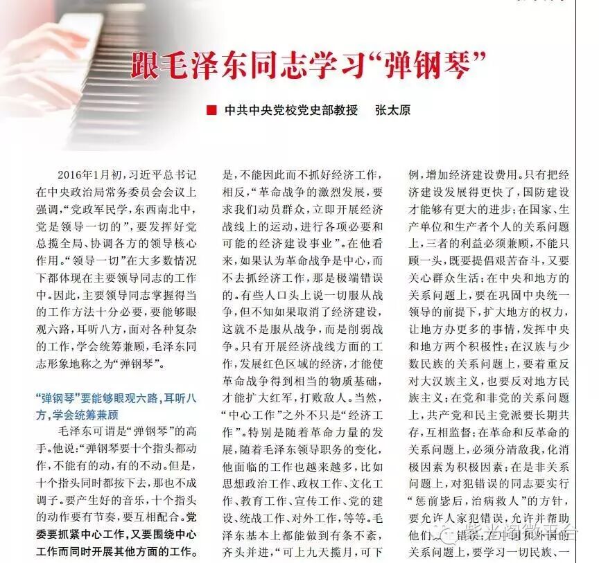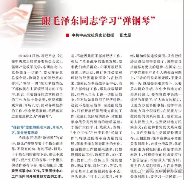 【小编说两句】 “党政军民学,东西南北中,党是领导一切的”,“领导一切”在大多数情况下都体现在主要领导同志的工作中,要掌握得当的工作方法,眼观六路,耳听八方,面对各种复杂的工作,学会统筹兼顾,毛泽东同志形象地称之为“弹钢琴”。今天,让我们一同跟毛泽东同志学习“弹钢琴”。